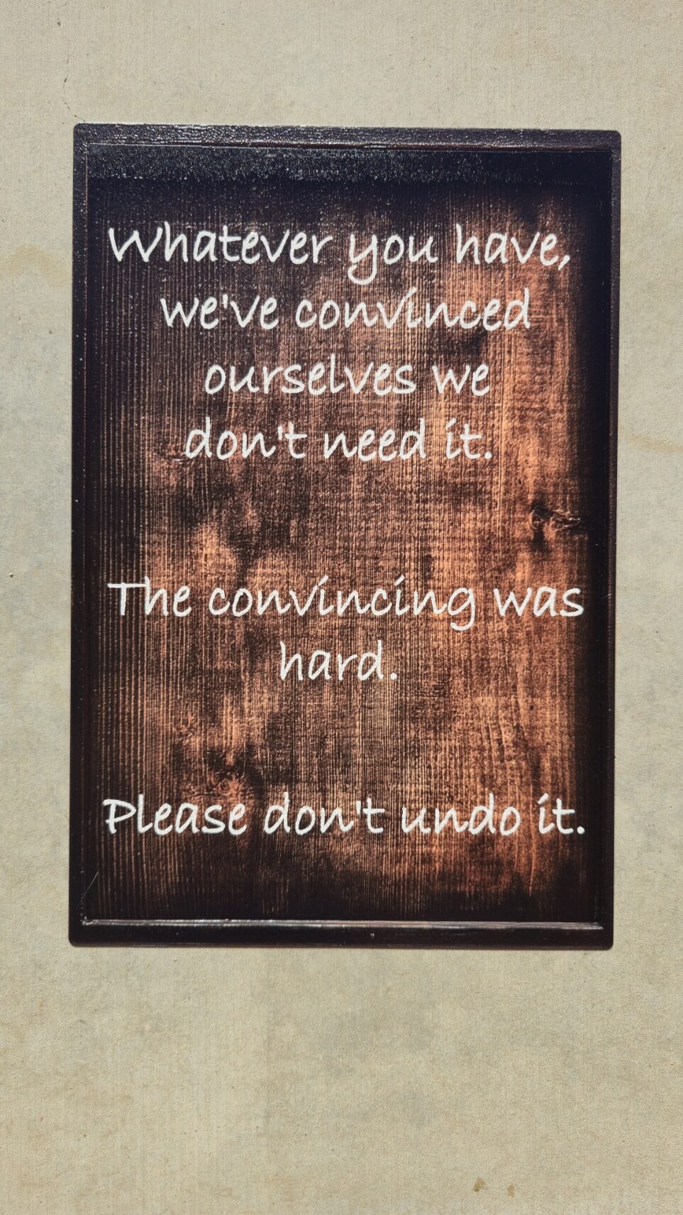 - “Whatever you have, we’ve convinced ourselves we don’t need it. The convincing was hard. Please don’t undo it.”