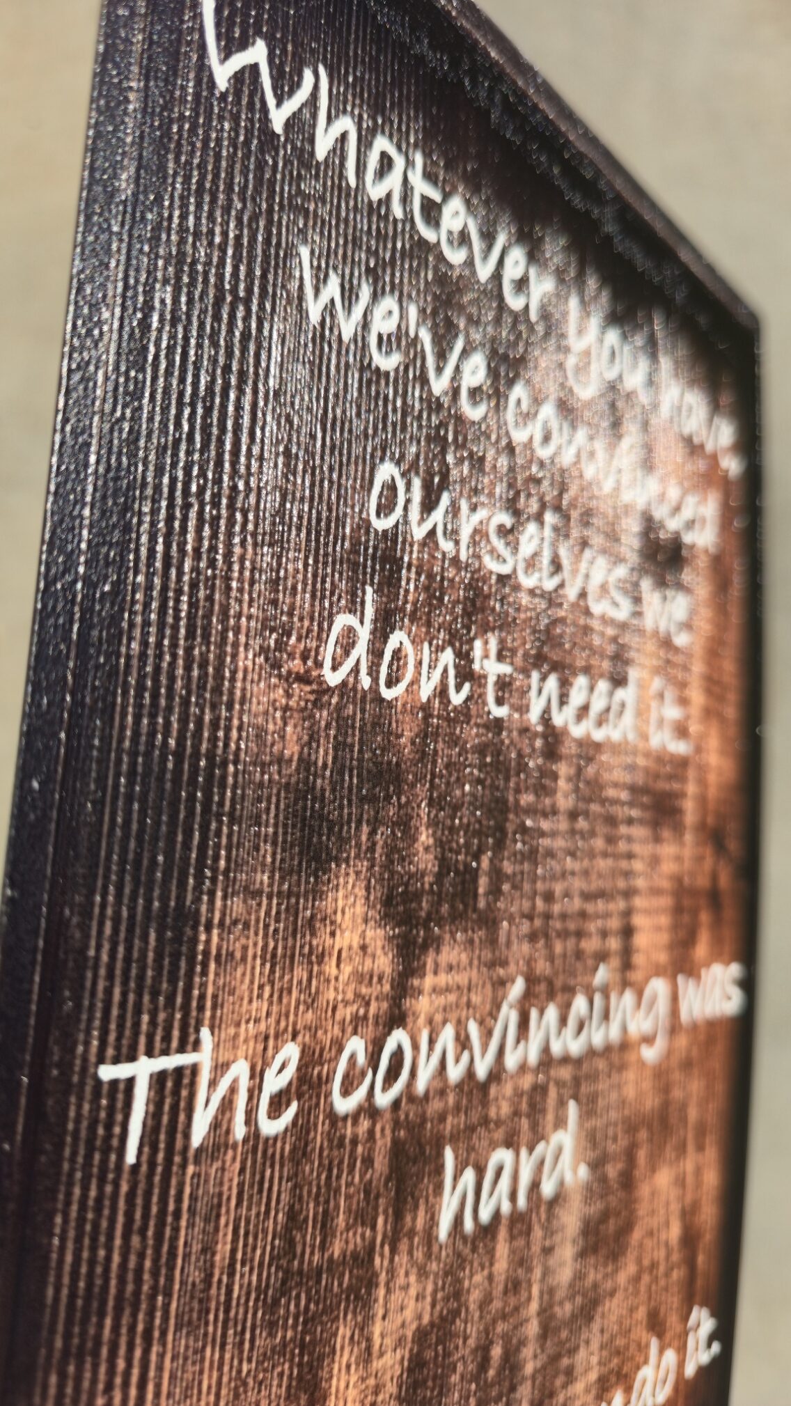 What you see is what you get — every photo in this listing shows the actual printed product, not a mockup or rendering. The rich dark wood grain background, crisp white script text, and textured raised-ink finish are all real.