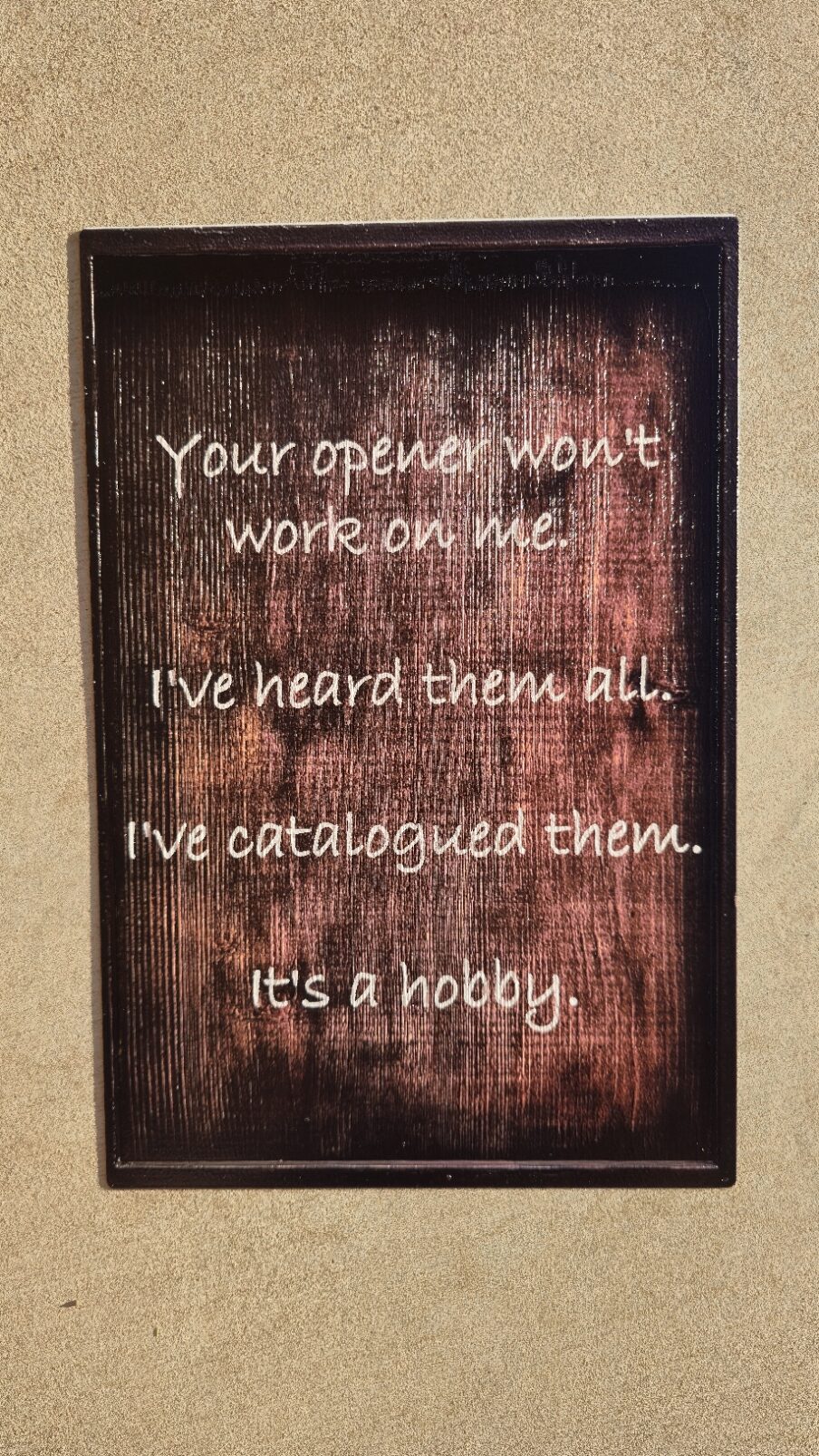 - “Your opener won’t work on me. I’ve heard them all. I’ve catalogued them. It’s a hobby.”